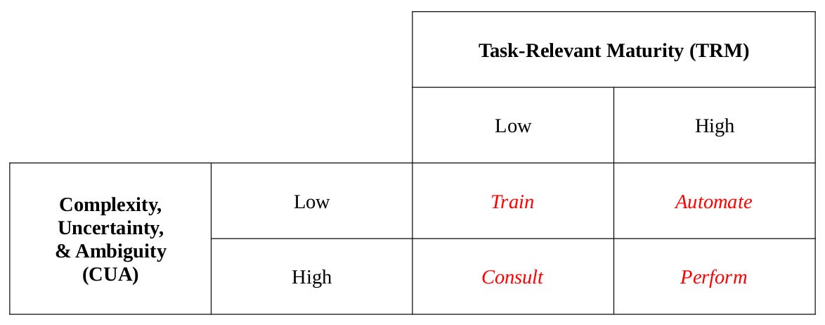 I use simple verbs that I remember easily, and which help me focus on my actions. I train myself when CUA is low and TRM is low. I automate as much as possible when CUA is low but TRM is high. I consult peers and mentors when I’m a nervous newbie in a high CUA situation with low TRM. And I perform using all my experience and expertise when my TRM is high despite being in a high CUA scenario. I repeat—these are my strategies. They have tangible benefits for me alone. You have to figure out for yourself if any of these will either help or hinder your work. But I’ll clarify couple of details in the hope of helping.