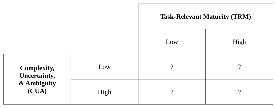 I feel nothing but disdain for acronyms. That is why I shoved a couple out of my mind and into the title. Pompous CUA stands for Complexity, Uncertainty, and Ambiguity—which I use as a proxy for the unpretentious environment that surrounds me wherever I’m working. Obnoxious TRM stands for Task-Relevant Maturity—which I use as a proxy for my unassuming expertise in relation to whatever work I’m doing. Then, you may ask, why not simply use environment for CUA and expertise for TRM? Well, I emphasised the word proxy in those earlier sentences for a reason. CUA and TRM have advantages in being unique, whereas each corresponding generic word is like an umbrella that shelters bickering bipeds who are standing cheek by jowl. Hence I’ll refrain from excessive generalisation, as it’ll unleash misleading equivalence among distinct meanings. CUA and TRM are thus two terrible terms with whom I’m willing to share my umbrella in the thick of torrential rain. Yes, it’s an alliterative abuse of irony indeed. Or, as I like to silently shout: “Jeer at Janus!” (I am referring, of course, to the ancient Roman god with two faces.)
