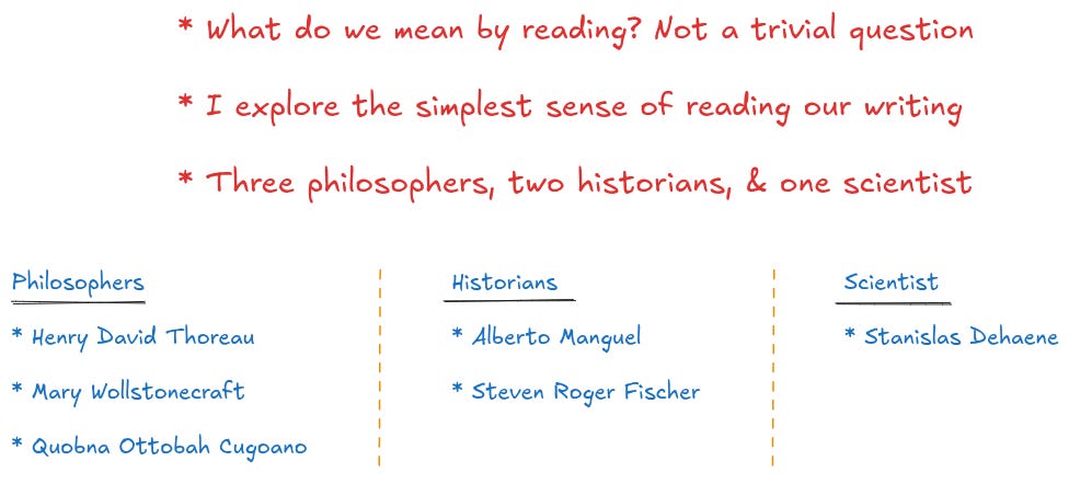 In this essay, I’ll explore only the simplest sense: reading what we’ve been writing. I’m naturally constrained when writing to highlight six astute thinkers out of so many. But I hope to explore the plural readings in future essays, since there are several brilliant thinkers who have expanded our understanding of the multiple meanings. And out of those who have studied the simplest sense over the millennia, my sample here includes three philosophers, two historians, and one scientist. Despite some categorical gaps in the sample, it still forms a secure platform that lets us board this train of thought about reading our writing.