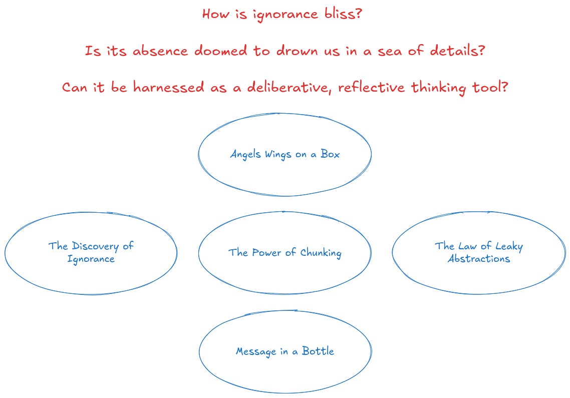 The buried, veiled, unrealised, or unconscious ignorance is not all bad for us though. The message from psychology is that humans have an almost unlimited ability for chunking, which is the unconscious process of lumping or grouping things into larger things, and then only dealing with those larger things in turn. It underlies our short-term memory and our endless ability to learn new motor skills. When confronted with many pieces of information, our brains chunk them into similar sets in a hierarchical manner, and repeat the process at each level of the hierarchy such that any granularity is lost within each chunk. It’s the kind of ignorance that’s hardwired into us, blissfully. Natural selection has shaped our brains so that we won’t drown in details when matters of survival are at stake.
